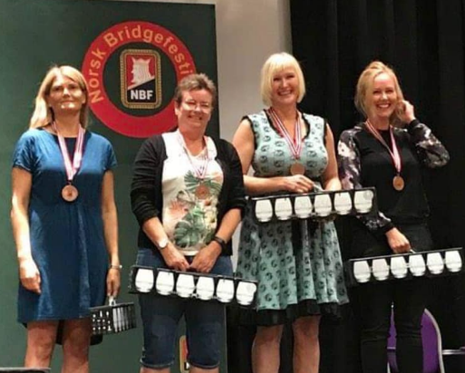 To tredeler av det norske damelandslaget viste fin form under bridgefestivalen da det ble bronse i NM Monrad Lag. F.v.: Fuglestad, Heskje, Harding og Vist