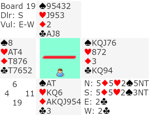 Det var ett par til som vant slem, de spilte 6 ruter som også kan betes. Det er kanskje enklere å bete den slemmen. Det vest må gjøre er å spille ut kløver og så etter at spillefører har trumfet ut lasjere to ganger med hjerter ess. Spillefører har ingen overgang til den fjerde hjerteren og ender opp med 1+2+7+1 = 11 stikk.