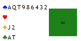 Sterk nikorts farge og ett ess ved siden av. Det er i praksis utgang på egen hånd. Så 2 kløveråpning kanskje? Det er ikke lov i henhold til reglene i New Zealand Bridge. Her må man ha et visst antall HP for å åpne med kravåpningen 2 kløver. Det er etter min mening en bisarr regel, men antagelig ment for å hindre bløffåpninger med 2 kløver, krav. Jeg vet ikke helt sikkert hvordan regelen er internasjonalt eller i andre land, for eksempel Norge. Men en kan jo tenke seg nikorts helt gående farge og ett ess (eller to), eller lignende hvor du har en helt bombesikker utgang på egen hånd, men kun 14 HP.