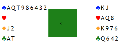 Det kan se ut som det er skvismuligheter. Nord har tross alt mye å passe på. Men det vil ikke fungere, det er ikke tilstrekkelig med overganger. Hvis det spilles "en bøtte" med spar er det ingen inntak til øst i det hele tatt, og N/S kan innrette seg etter hva vest har igjen.