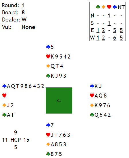 Utspillet ble vunnet og trumfesset presset ut. Siden vest ikke hadde flere spar fikk de ikke tak i sparstikk, og makker snellet raskt hjem 1+3+7+1 = 12 stikk. Eventyrscoren 980 med slike kort ga en nokså ufortjent topp i første spill.