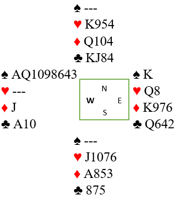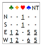 Computeren har altså funnet ut at N/S kan vinne kun en kontrakt, ett trekk i hjerter. Ø/V kan vinne mange kontrakter, bl.a. 6 spar om vest er spillefører, kun 5 spar om øst spiller kontrakten.