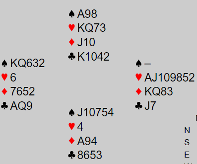 Med åpne kort (for motspillerne) bør det bli to bet i 4 hjerter med kløverutspill. N/S vinner ett stikk i kløver, to i trumf og to i ruter. Men syd kan ikke klandres for å spille ut spar knekt.