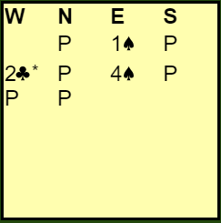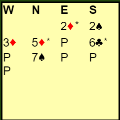 Ved det andre bordet passet vest. Det ser litt merkelig ut i gunstig sone, men forklaringen jeg har funnet er at paret spiller med andre 2 åpninger. Deres 2 ruter i gunstig er «Ekrens», begge major, og 2H/2S åpning viser den meldte fargen og en minorfarge. Selv liker jeg ikke å gi bort muligheten til å åpne med svake 2. En kan diskutere frem og tilbake hva som er best system, men det blir egentlig fånyttes. I noen spill vil det norske Ø/V-parets 2 åpninger fungere bedre. Jeg tipper at hun tenkte litt på en «fresk» 3 hjerteråpning, men det er kanskje litt mye «møllers tran»?