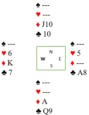 Etter å ha gitt bort hjerterstikket må spillefører ta alle trumfene først og komme til denne sluttposisjonen (hvis han har kvittet seg med hjerter 7!):
