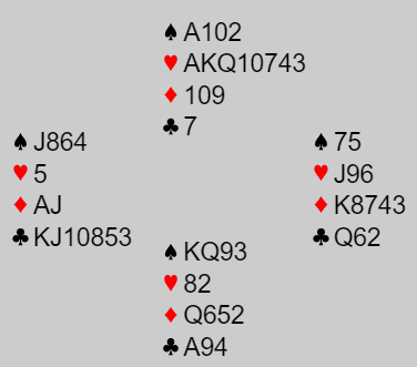 Meek var i 6 hjerter som er knallhardt meldt, og kontrakten går automatisk bet om det spilles ut ruter da det i så fall tapes to ruterstikk på to sekunder. Men vest hadde meldt inn kløver, så øst spilte naturlig nok ut kløver 2.