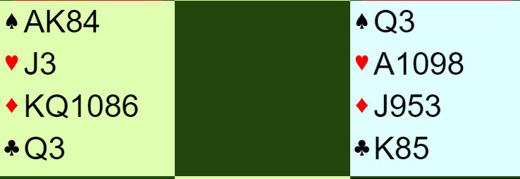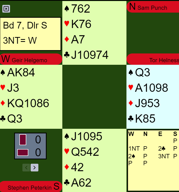 Av 28 scorer var tre i delkontrakt. Åtte lag gikk bet i 3NT, mens 17 av Ø/V-parene vant 3NT.
