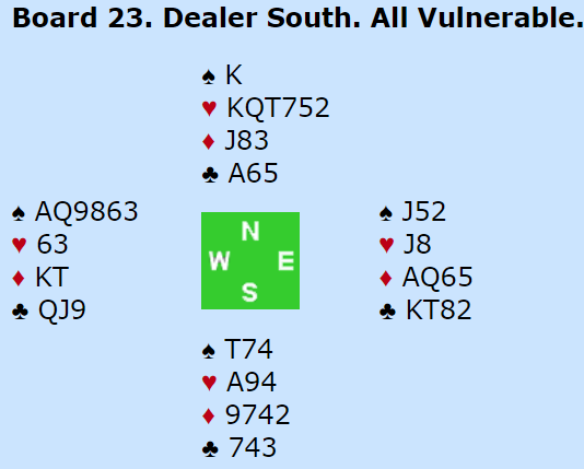 Med dette åpnet nesten alle, inkludert Christian Bakke for Norge. Makkeren hadde 12 ganske ordinære poeng med femkorts hjerter. Til tross for åpning av øst stoppet endel par i delkontrakt. Men utgang stod Ø/V selv om den var litt avhengig av grei sits. Igjen, resultatet kunne godt vært motsatt og de i delkontrakt ville vunnet IMPs.