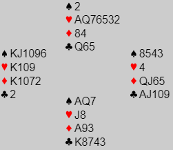 Slik hele spillet så ut hadde Ø/V en hjerterstopper, men kun sikker stopper hvis vest blir spillefører da han satt med K-x i hjerter. Om øst havner i grandkontrakt vil liten hjerter ut fra syd gi spillefører et meget kjedelig valg.
