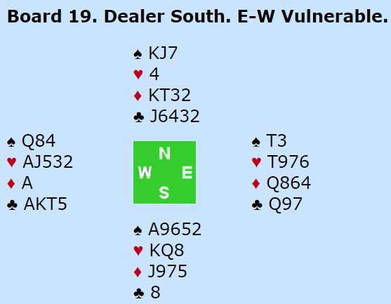 Her satt Steffen Simonsen (V)- Kåre Bogø (Ø) med Henrik Livgård (N)- Stig Dybdahl (S). Øst giver i ugunstig sone. Det ble et langt meldingsforløp der Ø-V fikk melde i fred: