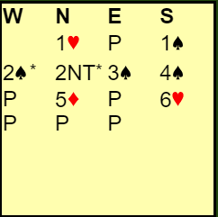 Det norske paret bruker en såkalt «good-bad 2NT» i denne meldesituasjonen. Nords 2NT viste bra kort og enten en minorfarge ved siden av hjerteren, eller lang hjerter. Med mindre og likevel interesse for å melde (fordelingshånd) kunne han meldt 3 ruter direkte. Denne hånden er vel på grensen mellom «good» og «bad», men Bakke vurderte den til «good» selv om det ikke er så mange HP. Godt vurdert synes jeg, glimrende hjerterfarge og fine, stikkgivende kort samt renons i spar. Østs 3 spar melding var avslørende denne gangen. Nå vurderte Grude veldig bra, han så for seg renonsen i spar. Kanskje kan nord ha singelton, men i så fall er han trolig sterkere i form av HP, for eksempel KQ i ruter.