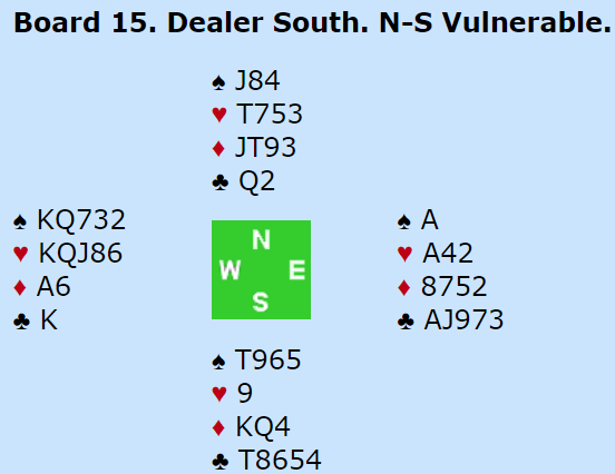 Spillefører kunne hoppet på med ruter knekt, men visste ikke at det var bra. Hun la liten ruter fra nord og vant med ruter dame over østs nier. Da hun i neste stikk prøvde seg med ruter konge lå vest unna. Dermed ble blindemann en øde ørken, og det ble en bet i kontrakten.
