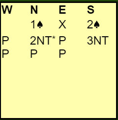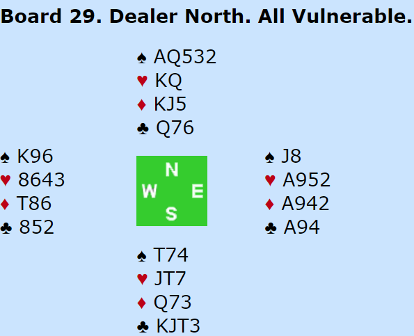 Ved første øyekast så det ut som om 3NT var ganske bra. Sparfargen blir godspilt med en taper, og motparten har tre ess. Merk at om de hadde havnet i 4 spar ville det vært helt dødt, taper til tre ess og ett trumfstikk. Det er egentlig en dårlig utgang dette.