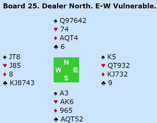 Den svenske øst spilte hjerter 9 da han var inne på spar konge. Spillefører fikk etter hvert to rutertapere og gikk en normal bet.