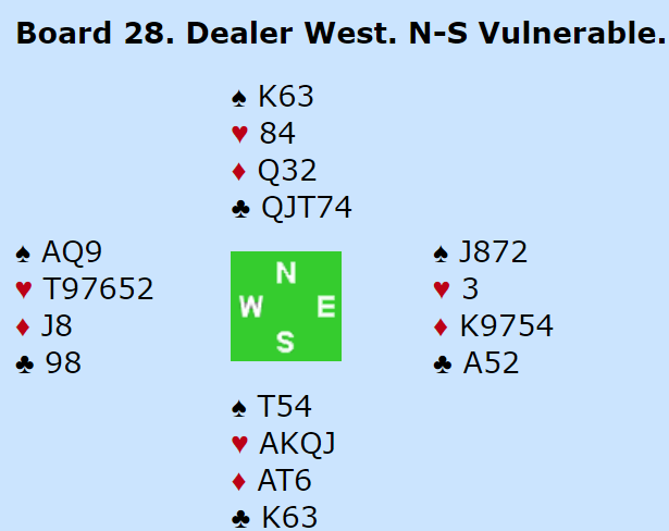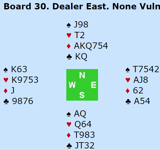 Aa spilte ut hjerter til østs ess og knekten kom tilbake. Dermed tok de fem hjerterstikk og kløver ess i full fart, to bet.