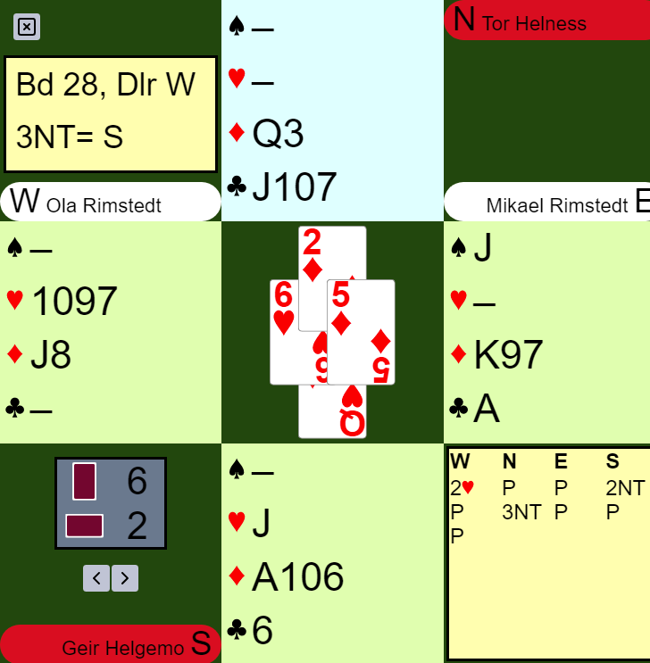 Vest hadde åpnet med svake 2 hjerter. I siste hånd sa Helgemo (syd) 2NT – naturlig, sterk grand – og Helness la på til 3NT.