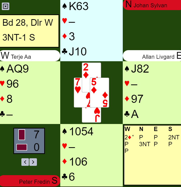 Ved det andre bordet åpnet Terje Aa (vest) med 2 ruter – såkalt «søppelmulti». Det viser en svak hånd med en majorfarge. Allan Livgård valgte å passe (normalt lang ruter) før Peter Fredin (syd) sa 2NT og nord løftet til utgang.