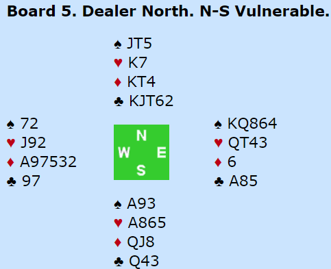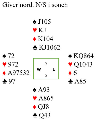 Ved mange bord åpnet nord med 1 kløver, og øst meldte inn 1 spar. Syd doblet for å vise hjerter, og det kan diskuteres hva nord bør si. Selv mener jeg 1NT er beste melding, og at det i denne situasjonen ikke nødvendigvis innebærer sparstopper. Noen flate åpningsmeldinger er helt umulige å melde i denne situasjonen. Her har selvsagt nord et brukbart alternativ til 1NT, 2 kløver.