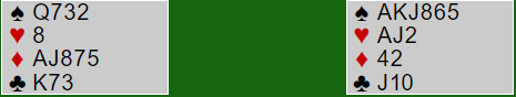 Nord var blitt lurt litt her, men han har nok i ettertid kommet frem til at å spille kløver idet han var inne er logisk uansett. Han ser jo at ruteren vil bli godspilt. Ø/V hadde ikke vært innom noen ess-spørring, og det kan vel hende øst faktisk har kløverkontroll, men bare en singelton? Nei, det stemmer ikke helt det heller. Med singelton kløver og en rutertaper ville nok spillefører ha prøvd kløver mot kongen for å godspille den. Men det er noe muffens her, hvorfor går han på ruteren med det same uten å ta ut trumfen? Kan han ha bruk for trumene senere? Men ruteren vil altså bli godspilt...