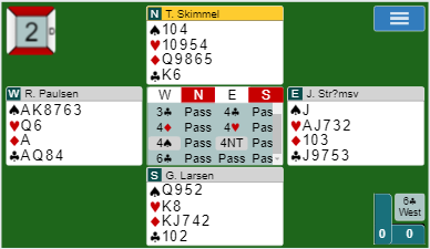 Ved det bordet de pga. BBO-overføringen startet med de siste spill-numrene hadde Sunndalsøra bommet i et spill og havnet i en nokså fæl 6 kløver. Det var mulig å havne i lilleslem i hjerter der – en mye bedre slem - men slik det satt går den også bet.