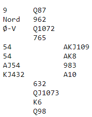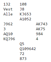 Samtlige Ø/V-par noterte utgang. En rekke par fikk 660 som ga -6,2, og endel fikk 690 som ga +13,5. Det er egentlig litt vanskelig å se for seg hvordan det blir elleve stikk, og ikke helt opplagt hvordan det blir tolv heller. For om man lukker igjen øynene og tar begge de sorte finessen blir det fem stikk i hver av de fargene pluss tre stikk i rødfargene, tretten totalt.