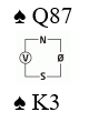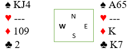 Syd spilte ut hjerter 3 til esset. Trumfen satt 2-2 og spillefører sendte i vei en liten kløver mot Q-J-2. Damen vant stikket. Underveis trumfet han opp vest sine to gjenværende hjerter og spilte nok en liten kløver mot J-2. Syd la nok en gang liten og knekten vant stikket.