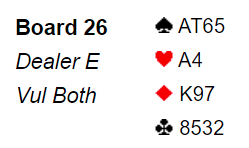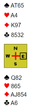 I ekstasen over å ha sett det fine innspillet var jeg litt for rask og klikket etter å ha tatt for kløver ess på hjerter 6! Vests syver kom på, og øst kunne følge med toeren! Siden vest var inne førte spar derfra til at det ble en bet. (Vest måtte unngå å ta sine to kløverstikk, da blir nords siste kløver det niende stikket)