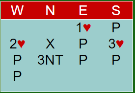 Øst passet, og det ble en liten stressfølelse da makker meldte 3 hjerter – krav. Vel, det var bare å si 3NT og håpe det beste. Makker hadde ikke meldt inn, så det ser ikke særlig lyst ut. Men kanskje har han en lang minorfarge, og da kan det kanskje bli noen stikk. Etter 3NT fra nord gikk det pass rundt.