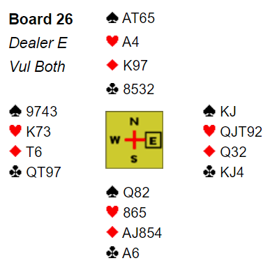 Dessverre var det undertegnede som feilet, men jeg forteller spillet likevel. I ettertid må det kanskje innrømmes at det faktisk ble gjort to feil med denne hjerteren. Det var dog det siste feilspillet som var mest spektakulært, og det ble nesten komisk.