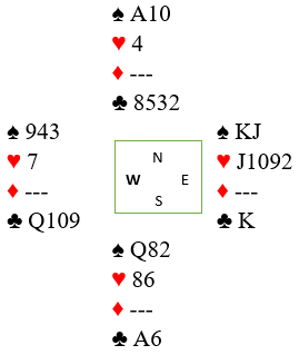 Hvis øst hadde valgt å holde to kløver måtte han enten blanket spar konge, eller kastet en hjerter. Kaster han en hjerter på den siste ruteren for å holder to kløver er det bare å spille god spar dame, øst har i så fall kun tre hjerterstikk å ta. Øst kastet altså kløver knekt og det så ut som i diagrammet. Så kløver ess og hjerter, og øst blir innspilt.