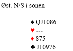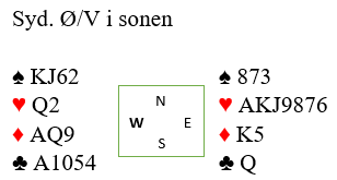 Tormod åpnet i 2. hånd med 1 hjerter, pass fra Nord og naturlig svar 1 spar herfra. Nå gikk Syd innpå med 2 kløver og Eriksen støttet med 2 spar. Da har han fortalt om 4 spar og 5+ hjerter men kan max ha ca 14 hp. Med fordeling (2 p for singelton i ruter) har jeg 11 fordelingspoeng men da Nord nå ikke ville avgi bud over 2 spar anså jeg at utgang likvel neppe kunne stå. Dermed ble det pass rundt. Og det iste seg å våre et bra valg- for oss.