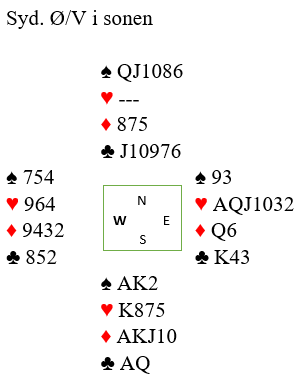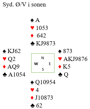 To par ble åpnet med svake 2 spar av Syd, og da Vest meldte innpå 3 kløver presset Nord maksimalt på med hopp til 4 spar. Men Øst spurte etter ess og svar 5 kløver viste at makker hadde 3 (eller 0) og da Nord ennå en gang «tok stamp på forskudd» ved å by 6 spar var ikke Øst snauere enn å melde 7 kløver! Den kontrakten var det ikke noe å gjøre med. Et annet par ble etter pass i åpning fra Syd som senere meldet inn 2 spar over 1 ruter og Nord var med på notene ble Ø-V presset opp men valgte stopp i 6 NT som også var å legge ned. Resten kom i 6 kløver. Jon fikk pass før seg, åpnet med 1 kløver som jeg svaryte 1 ruter (avventende) på og da Syd så hoppet til 2 spar, Jon gjentok sin langfarge med 3 kløver og Nord svarte 3 spar. Da anså jeg det umulig at makker kunne mangle to ess og slo til med 6 kløver, men det ga jo heller moderat score siden storeslem sto i både grand og kløver.