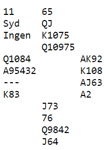 På DONNER spilte en gammel kjenning, ex-Kiwien Ish Del Monte som jeg fortalte om her i bloggen forleden. Han var involvert i ett av de største svingspillene i settet de tapte med hele 57 IMP (15 spill). De tapte kampen med kun 22 IMP etter hele 120 spill.