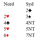 Øst giver med ingen og med 16 hp er 1 NT eller 1 spar aktuelle åpningsbud og og Vest med 12 hp og flott 7- kort hjerter vil mye, men klarer dere å få meldt 6 hjerter. Aktuelt klarte ingen det.