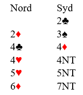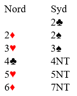 Terje startet med kravåpning 2 kløver og jeg meldte avventende 2 ruter (liker best å melde positivt 3 kløver med så gode og positive kort). Terje fortsatte da med hopp til 3 spar og jeg svarte 4 kløver. Da han nå meldte 4 ruer (kontrollmelding) svartte jeg 4 hjerter, men det kan tolkes som kontrollbud (altså ser det ut som renons/singelton). Men Terje avsluttet da med spm. 4 NT, og da jeg viste 1 ess var 7 NT naturlig stopp.