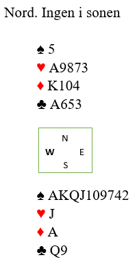 Nord var giver med ingen i sonen. Hvor høyt melder dere her., 12+ 16 poeng er nok til utgang, men hva med slem? Nord hadde sp K95- hj D9- ru 974- kl DJ942 og «alt satt som bestilt» bortsett fra spar konge som var bak. Likevel 12 stikk i spar, men ingen meldte seg ut til det.
