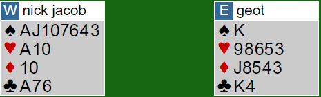 Dette skjedde ved det andre bordet hvor spillefører fullstendig overså faremomentet og "claimet" (forlangte ti stikk) idet hun hadde spilt spar ess fulgt av spar knekt til nords dame. "Nei, det går vi ikke med på", sa N/S. og så tok de to røde stikk før hjerter fra syd ordnet betestikket for nords trumfnier.