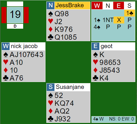 Etter å ha tatt en kløverstjeling med trumf konge ble det ved begge bord spilt hjerter til esset, spar ess og stor spar. Min makker spilte i alle fall litt bedre enn ved det andre bordet da han spilte spar ess fulgt av spar 10. Det spiller egentlig ingen rolle, men nord lå unna, en soleklar feil selv om hun ikke ser vest sine kort. Hun har jo selv spar 9 så selv om syd har knekten koster det ingen ting å dekke tieren å se knektne komme på, for da står jo nieren.