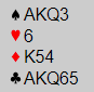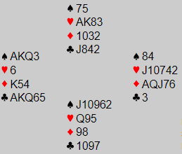 Toppen N/S gikk til et par som fikk spille mot vests 6NT som nord doblet. Der åpnet vest med 1 kløver og sa stille og rolig 1 spar over svaret 1 hjerter. Men så i neste runde fikk vest litt hastverk og suste på med 4NT, for han hadde jo så mye ekstra! Ha avsluttet med 6Nt somnord ikke trodde på. Det kunne godt ha vært greit nok å melde slik om øst hadde hatt bedre hjerter, men her ble det helt feil. 6NT doblet gikk to doblede bet (+300 til N/S) da det viste seg de hadde tre hjerterstikk fra start.