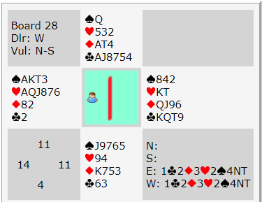 Så kontrakten 4 hjerter var ikke optimal. Det er lett å se at 3NT kan vinnes, men det er kanskje ikke så lett å melde. Vest sa etterpå at hun tenkte på å melde 2 spar i stedet for 3 hjerter. Da kan de kanskje finne grandkontrakt. Det har noe for seg å fortelle om sparfargen, for både sparkontrakt og grandkontrakt kan være tingen her. Men 2 spar er heller ikke beste melding.