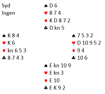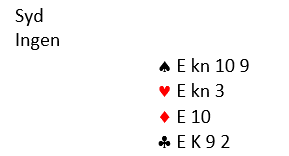 Spillefører prøvde sitt beste ved å spille liten spar, men da kunne vest ta for spar knekt og spar ess. Dermed kunne det ikke trumfes mer enn to kløver hos syd, og det endte med en bet.