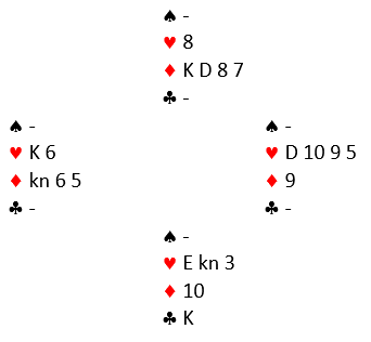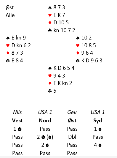 Vest spilte ut kløver. Geir vant med damen fulgt av spar dame som fikk løpe til kongen hos vest. Det kom mer kløver.
