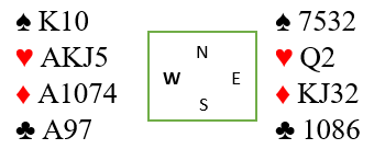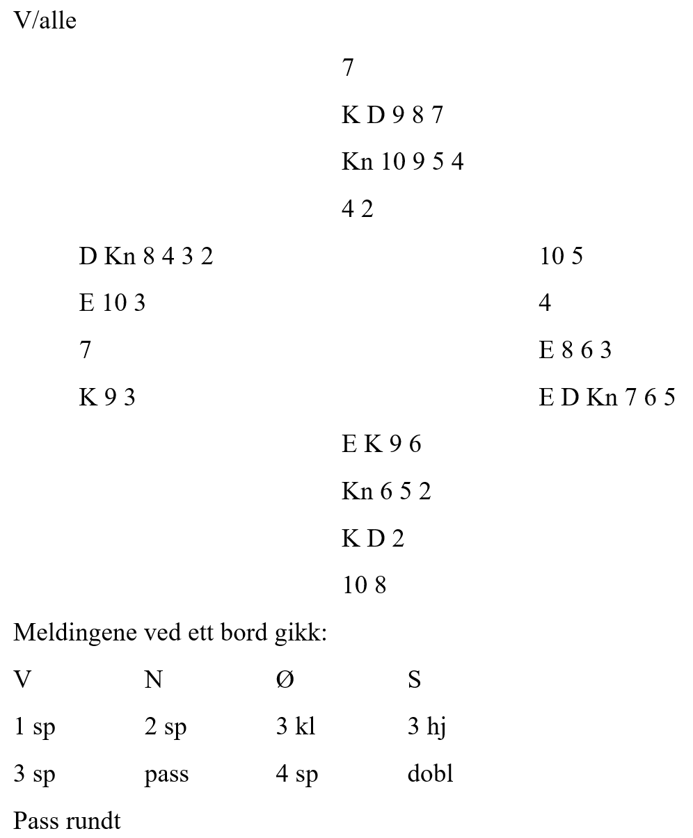 Ved det andre bordet hadde ikke syd doblet og vist kløver, og nord spilte ut spar mot 3NT. Spillefører måtte få tak i ekstra stikk i ruter for å komme til ni, og da han gjettet riktig i den fargen riktig ble det utgang til notering.