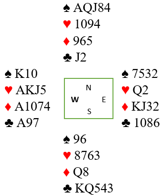 Før spillefører bestemte seg om hvilken vei han skulle spille ruteren tok han fire runder hjerter. Syd fulgte farge alle fire rundene, og dermed var han plassert med ni kort i hjerter og kløver. Nå er det klart størst sjanse for å spille på ruter dame hos nord som trolig har ruterlengden. Ruter ess ble fulgt av ruter til finesse, men kortene stemte ikke med sannsynlighetene i dette tilfellet: