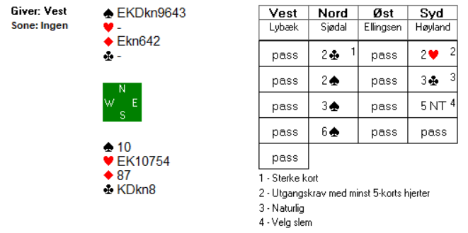 Vi ser at den manglende hjelpen i ruter som vi fryktet kan bli et problem, men det er jo i praksis umulig for syd å stoppe under slem etter denne innledninga på meldingsforløpet. Likevel skal det sies at spar 10 hos blindemann er et viktig kort som gir økte forhåpninger om at kontrakten kan stå.