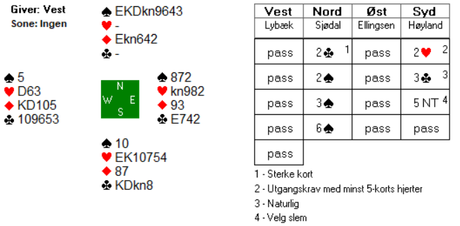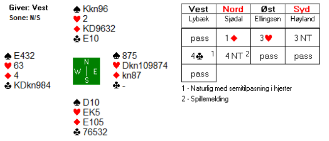 Sofie Græsholt Sjødal valgte å ta sjansen på 4 grand over 4 kløver da man i disse soneforholdene må ha mange beit i motpartens stamp for å få utgangsscore. Denne gangble det ikke riktig da vest fikk satt opp kløveren i utspillet og måtte komme inn på spar ess etter at spillefører hadde hentet kløver ess og åtte røde stikk.
