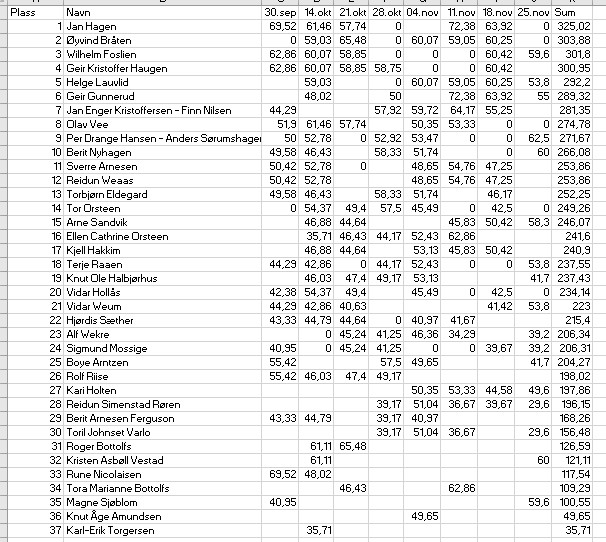 Her er ferdig liste. 1. pl Jan Hagen, 2.pl Øyvind Bråten og 3. pl Wilhelm Foslien og Geir K Haugen. Selv om de står på 3. og 4. pl. Har de spilt sammen i 7 kvelder, og blir derfor regna som et par.