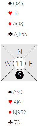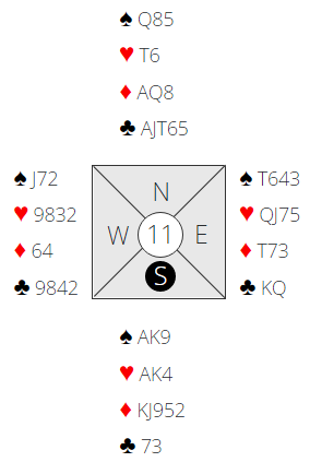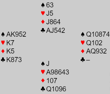 Men med hjerter ut og mer hjerter idet øst er inne på en kløverhonnør blir det et kinkig valg om å spille på den andre kløverfinessen, eller ta sine elleve. Hele 21 par spilte på ekstra stikk (deriblant mot vinnerparet), de tok en andre kløverfinesse helt mot slutten og fikk ikke flere stikk! De hadde tatt ti stikk på det tidspunktet. Pluss 430 ga 25% score. Jeg synes det er helt greit spilt som gir en god sjanse til å få tolv stikk, men de ble feil denne gangen.