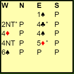 Østs 4 kløver viste renons. Vest har en bortkastet kløver konge, men resten er sannelig gullkantet. Så hun gikk på til slem via Roman Key Card Blackwood. Merk at de manger to ess, men vest vet altså om reonsen i kløver, så forsvaret har kun ett ess å ta for.