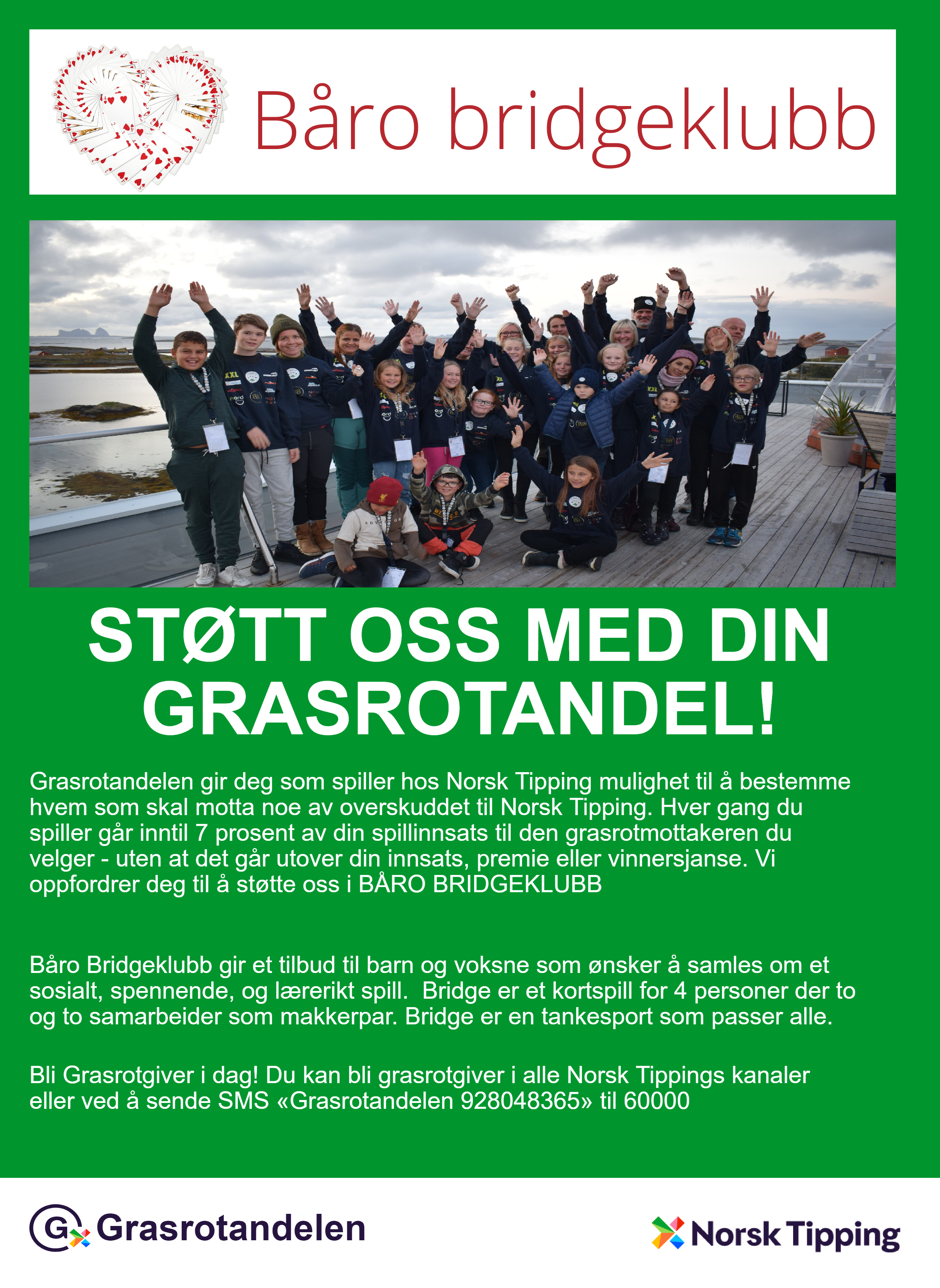 Velg Båro Bridgeklubb som din grasrotmottaker ved å sende sms "Grasrotandelen 928048365" til 6000. Det koster ingenting, annet enn 1 minutt av din tid, og ungene i Båro BK vil få 7 % av det du tipper for fra Norsk Tipping.